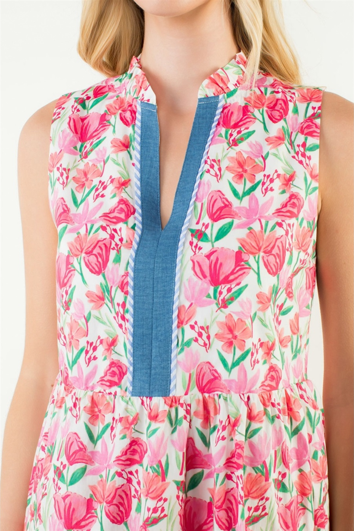 Regular price $98.00 Save $-98.00Effortless elegance meets playful style in this sleeveless tiered dress. Delicate pink florals dance across the fabric while a striking blue striped panel runs down the center, creating a charming contrast. The tiered silhouette offers flattering movement and dimension, perfect for warm-weather occasions. Whether you're heading to brunch or a garden party, this dress combines feminine details with modern flair for a look that feels both fresh and put-together.