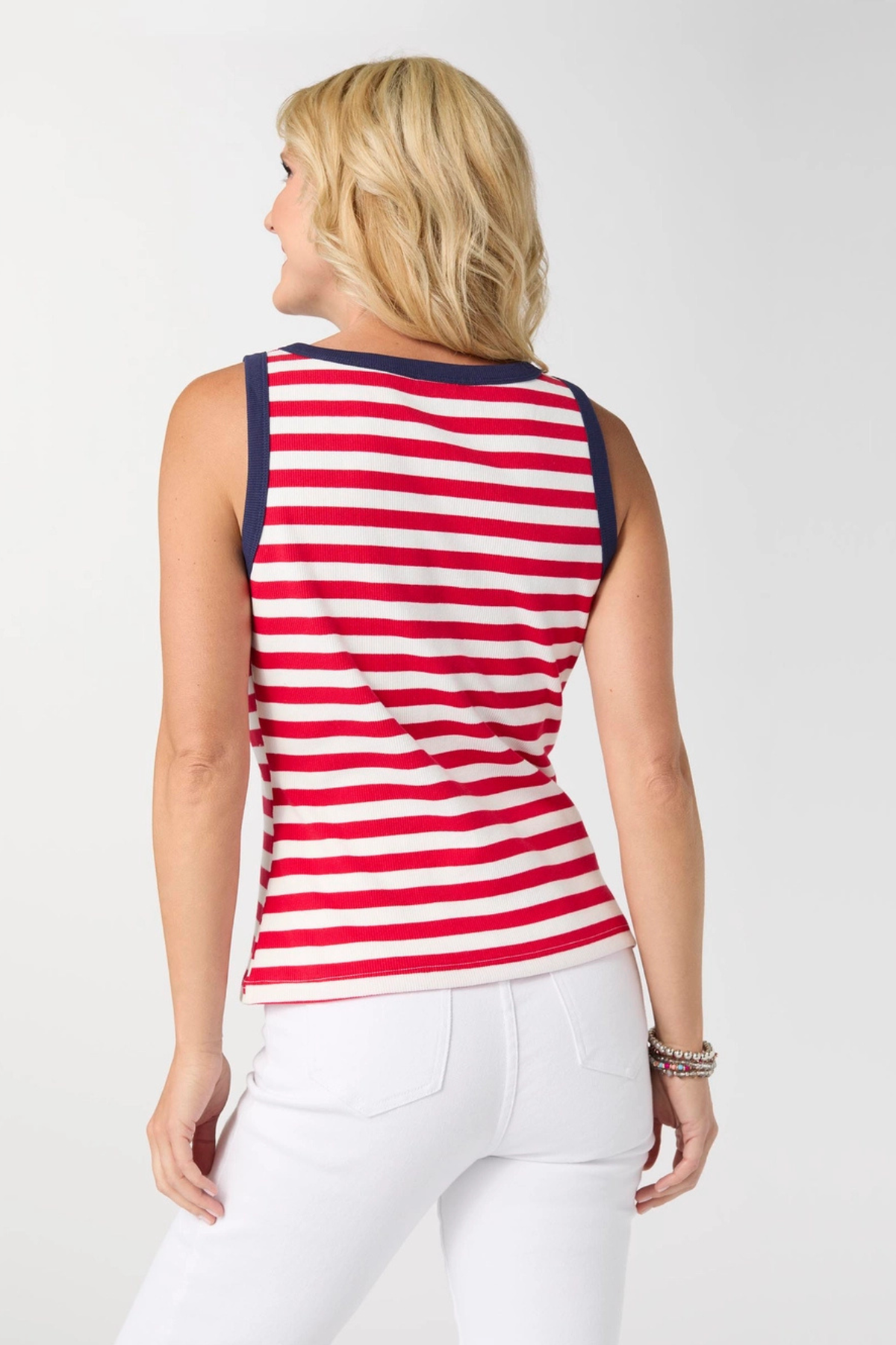 Regular price $49.00 Save $-49.00Bold stripes and a sporty silhouette give the Sawyer Striped Rib Tank its easy, everyday appeal. Designed with a fitted ribbed texture and contrast trim along the neckline and armholes, this sleeveless tank delivers a flattering, streamlined look with comfortable stretch. Lightweight and versatile, it's perfect for warm-weather wear or layering under jackets and cardigans. Pair it with denim, shorts, or skirts for effortless casual styling.