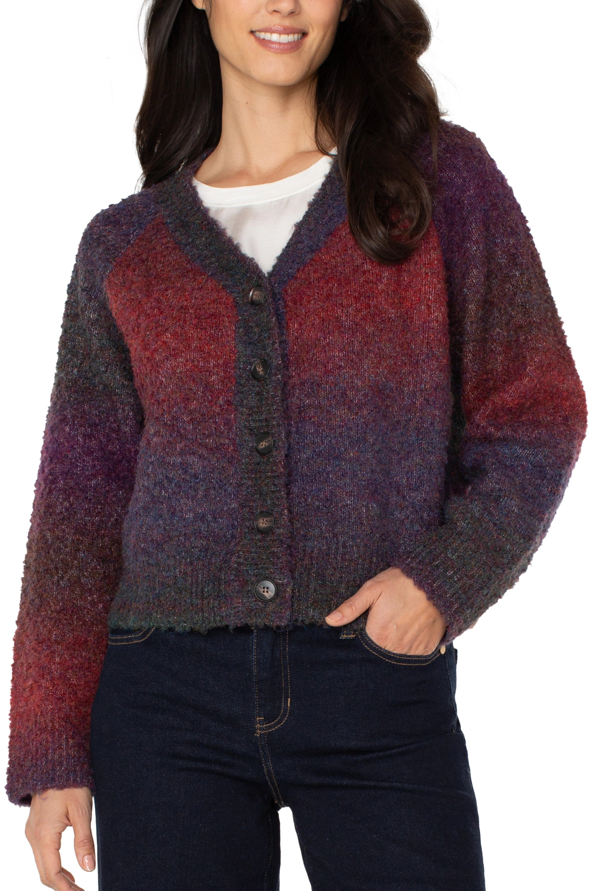 Regular price $109.00 Save $-109.00This raglan sleeve cardigan features a beautiful ombré knit that transitions from rich berry to deep burgundy, offering a fresh twist on a classic style. Ribbed trim and a button-front closure add refined detail, making it easy to layer or wear solo. Perfect for adding warmth and color to any outfit.