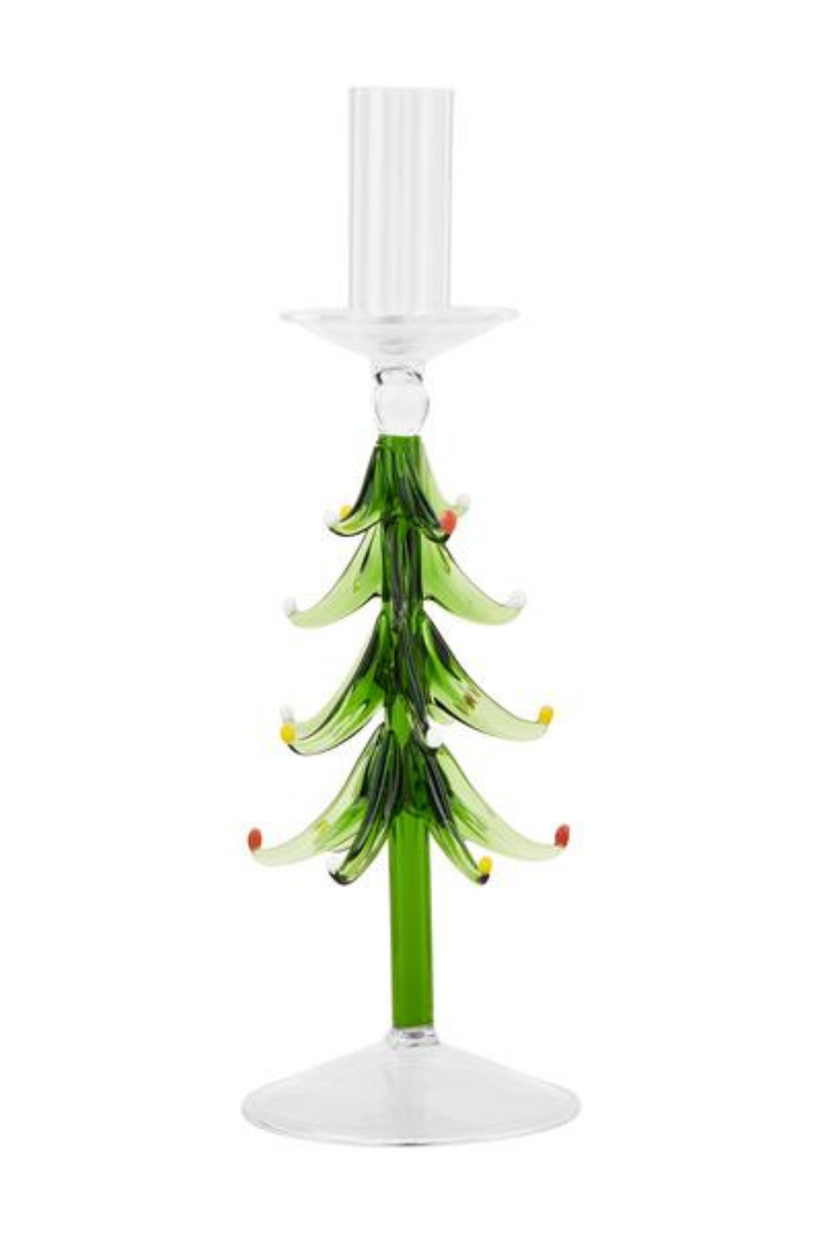 The Large Tree Taper Holder stands 9 1/2 inches tall, featuring a detailed figural tree design crafted from clear glass. Its elegant form allows candlelight to shine through beautifully, creating a warm, inviting glow. Perfect as a centerpiece, mantel accent, or dining table highlight, this durable and high-quality taper holder adds sophistication and charm to any setting.