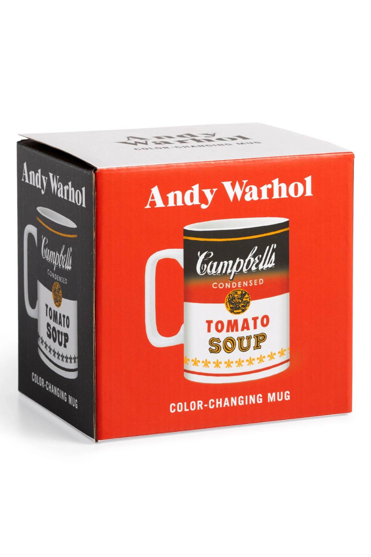 Bring one of Andy Warhol’s most famous artworks to life during every one of your coffee and tea breaks. This ceramic mug is printed with a detail from Warhol’s Campbell’s Soup Cans (1962)—an artwork in MoMA’s collection—and when cold or empty, the soup can design is black. But once you pour a hot beverage into the mug, it quickly changes to the true colors of the artwork, red and yellow. The Andy Warhol Color-Changing Soup Can Mug measures 4h x 3.5”diam. Do not heat the mug in the microwave. Hand wash only.