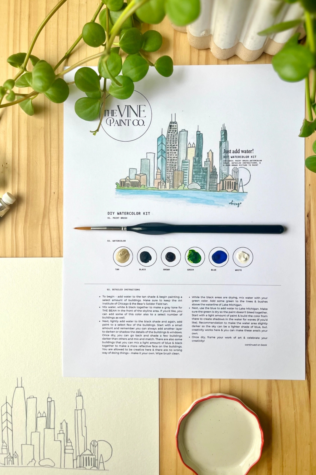Regular price $22.00 Save $-22.00Chicago DIY watercolor paint kit has everything included, just add water! Each kit comes with detailed instructions, custom watercolor paints to the image, a paint brush, and a hand drawn sketch for you to paint. There is also an added piece of thick cardboard for easier displaying & extra protection. Perfect to do alone as a pause & reset or grab a few kits and paint with wine & friends! For Chicago lovers only!